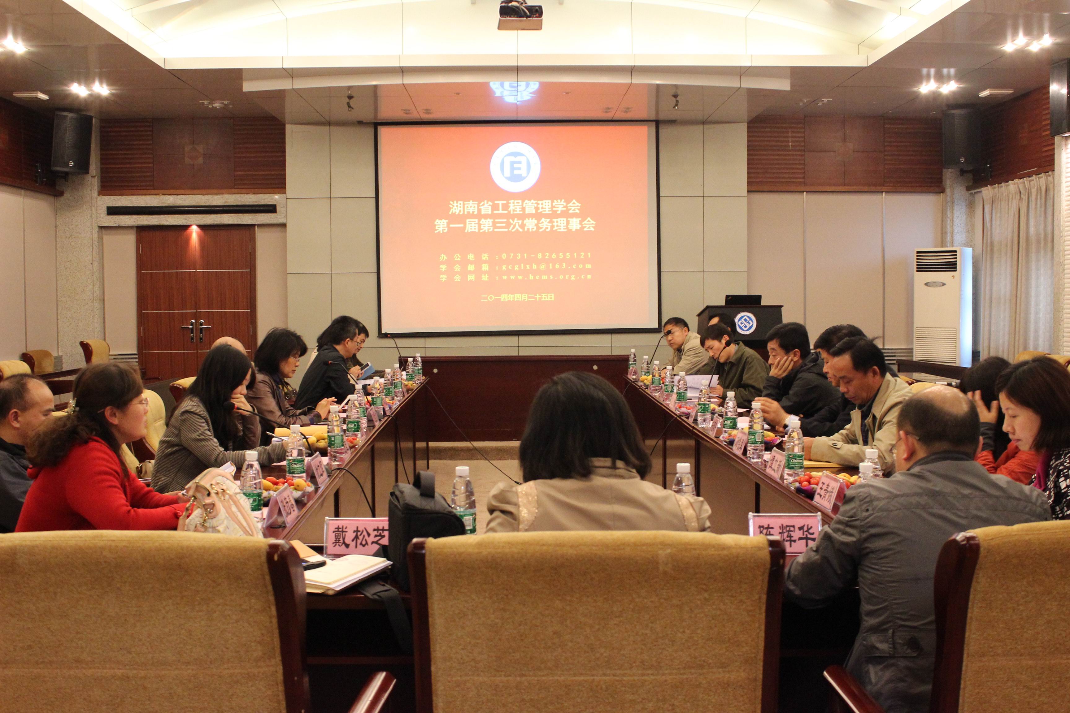 2014年4月25日下午3点,湖南省工程管理学会第一届第三次常务理事会在中南大学铁道校区世纪楼14楼会议室召开,共有15位常务理事出席会议,学会顾问杨承惁教授、特邀代表湖南德成建设工程有限公司副总经理谭国锋及秘书处全体人员列席会议,会议由秘书长陈昭平主持。