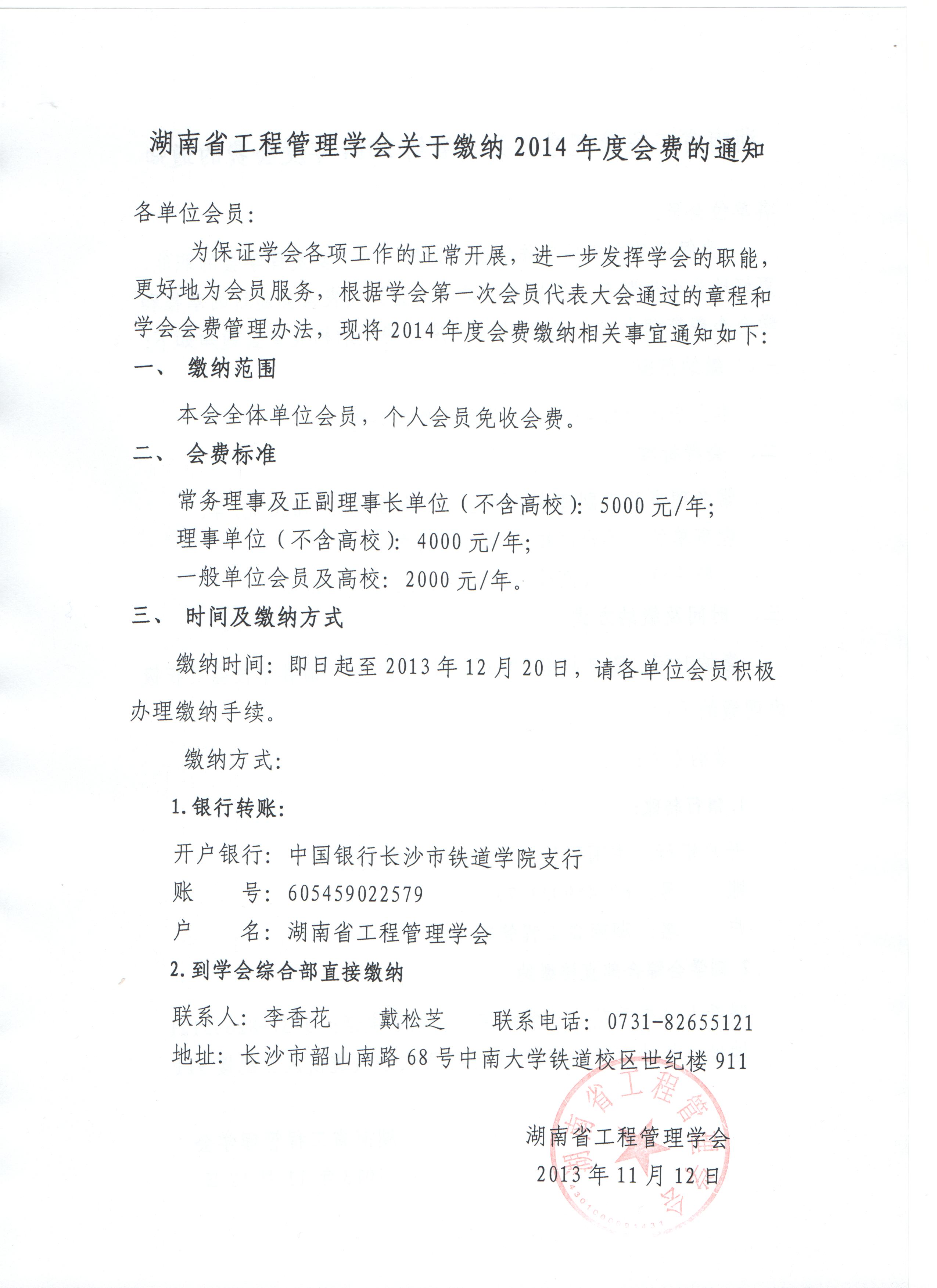 湖南省工程管理学会关于缴纳2014年度会费的通知
