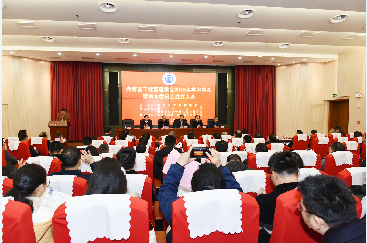 12月28日上午,由湖南省工程管理学会主办,湖南大学、湖南大学设计院有限公司共同承办,深圳市斯维尔科技股份有限公司协办的湖南省工程管理学会2019年学术年会暨青年委员会成立大会在湖南大学设计院会议室召开。湖南省科协学会部胡为平部长,省科协派驻学会党支部第一书记周辉军,湖南大学副校长徐国正教授,中南大学党委副书记、学会理事长黄健陵教授,中南大学基建处处长、学会常务副理事长郭峰教授,湖南大学土木工程学院院长施周教授,湖南大学设计研究院有限公司董事长邓铁军,学会顾问、湖南大学崔起鸾教授,学会第二届理事会副理事长、常务理事、理事、秘书处以及来自高校、企业等各会员代表共200余人参加了会议。